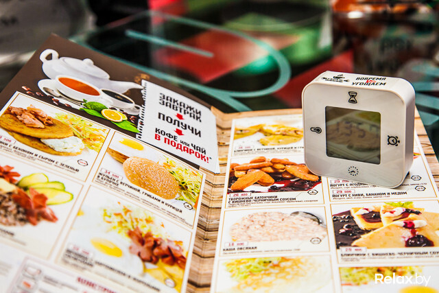 Заказ. Многообещающе звучит предложение: если заказ не приносят в течение 15 минут, то гость получает его бесплатно. На вопрос о том, как часто посетителям приходится не оплачивать счет, приветливая официантка улыбается: «Бывает и такое! Чаще всего мы, конечно, успеваем. Но бывают редкие случаи в обеденное время, когда кухня загружена по максимуму». На столе появляется таймер: справедливо — следить за временем так удобнее, чем по часам, например, на телефоне. Подметим, в других заведениях с аналогичной акцией таймер нам не предлагали. Единственная рекомендация: не трогайте его руками. Пару неумелых движений, и цифры могут сбиться.