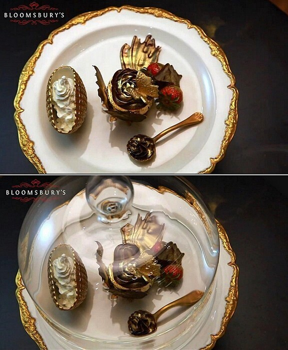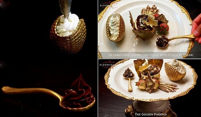 Golden Phoenix Cupcake — это удивительное драгоценное лакомство от Bloomsbury, которое обойдется настоящим гурманам в 1000$. Почему именно такая сумма? Кроме съедобной золотой фольги, в которую заворачивают кекс, и пищевых золотых хлопьев, в десерте используется фирменное масло из Англии, итальянское какао Premium Amedei Porcelena и стручки ванили из Уганды. Украшают десерт клубникой в золоте и ложечкой с шоколадной глазурью.