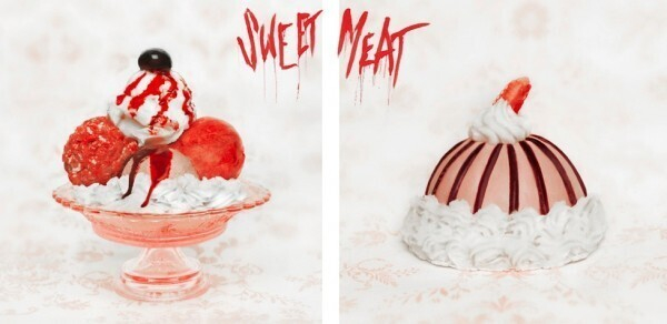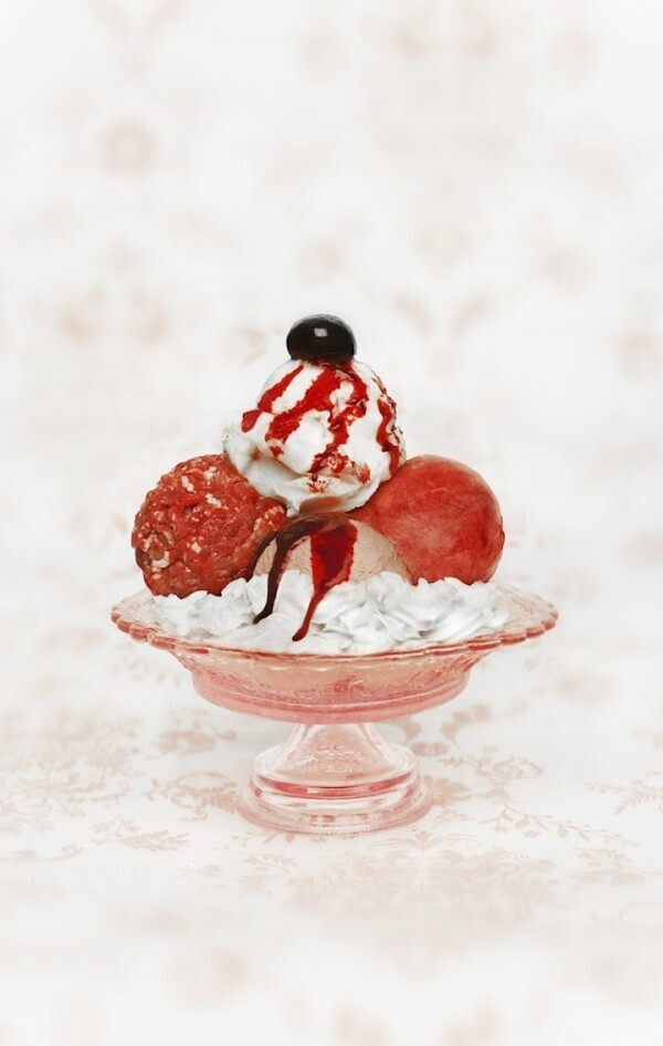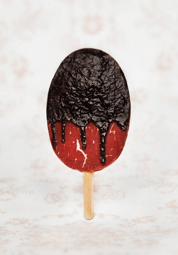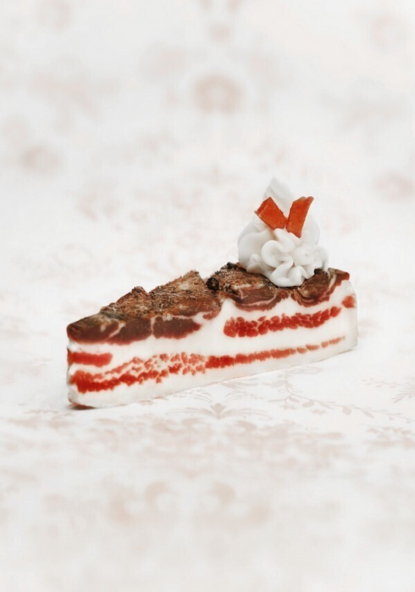 Немецкий фотограф Jasmine Schuller решила заняться подменой понятий. Серия ее фотографий под названием Sweet Meat лишь на первый взгляд кажется аппетитной. Здесь изображены вовсе не сладкие десерты, а обыкновенное сырое мясо, сало и колбаса в виде пирожных. «Я не знаю, каково на вкус мясо со взбитыми сливками, но выглядит это красиво», - объясняет свою идею Жасмин.
