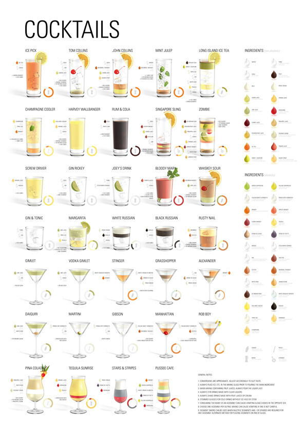 То, чего нам всем так часто не хватает! Немецкий дизайнер Константин Датз (Konstantin Datz) сделал серию постеров с рецептами известных коктейлей и их изображений. Теперь любую вечеринку можно разнообразить множеством вариантов, которые всегда под рукой.