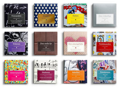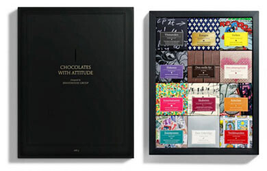 Датской компанией Bessermachen DesignStudio выпущена новая серия шоколадных плиток под названием ‘Chocolates with Attitude‘. Произведение для гурманов было создано в сотрудничестве с настоящим художником шоколадного искусства Хенриком Коннерупом. Из 12 000 маленьких плиточек шоколада ручной работы была сделана 1 000 оригинальных коробок. Каждая плитка весит 50 г, а каждому вкусу соответствует свой дизайн. Таким образом, компания Brandhouse хотела показать, насколько индивидуальным может быть подход к каждому отдельному продукту.