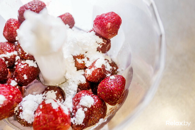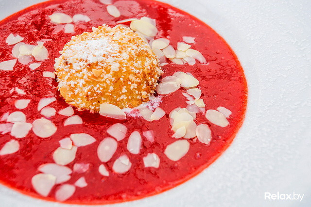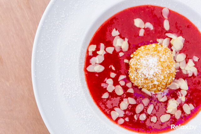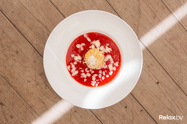 Дело в рецептуре — в составе блюда есть клубника, белый ром, мята, сахарная пудра и лепестки миндаля. Суп действительно запоминается: мята удачно перебивает привкус алкоголя. На наш субъективный взгляд, десерт чем-то похож на смузи. Блюдо оценят любители жареного мороженого. Кстати, в Минске можно попробовать и