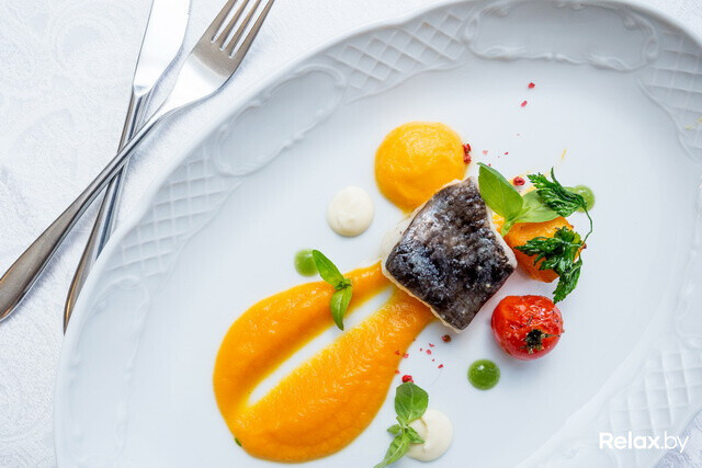 05 Филе сома с пастернаком, тыквенно-лаймовым пюре и соусом из сока петрушки