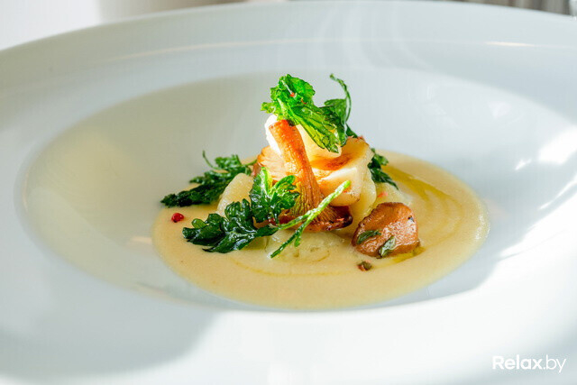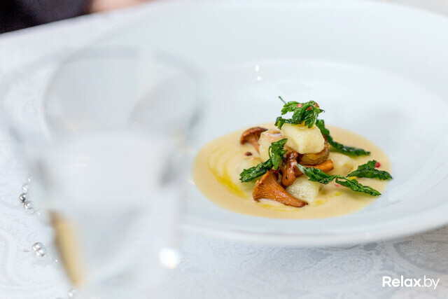 На дне тарелки — соус из жареного лука и бекона. Повар добавил немного сливочного масла, молока и сливок, а после — процедил через мелкое сито. Клецки делают из картофеля с яйцом, мукой и тимьяном. Грибов два вида: лисички и белые, также обжаренные. Масло белого трюфеля используют для контраста вкусов. Зелень жарят по фритюре.