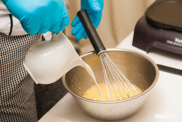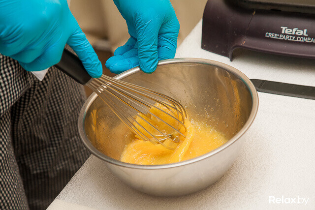 Приготовление теста знакомо любой хозяйке. В яйца Артем добавил пару ложек сахара, ложечку соли и взбил венчиком (шеф-повар сознательно не пользуется миксером). В получившийся меланж отправился кефир и необходимое количество просеянной муки двух видов. Повторяя дома, не забывайте: тесто для жарки тонких блинов на сковороде должно быть жидким, а для блинчиков-панкейков ― чуть гуще. Ложку сухого молока Артем добавляет ради сливочного вкуса, которого практически лишено пастеризованное молоко. После добавления разрыхлителя и сливочного масла тесто лучше оставить в покое на 15―20 минут: оно станет пористым и будет лучше распределяться по сковороде.