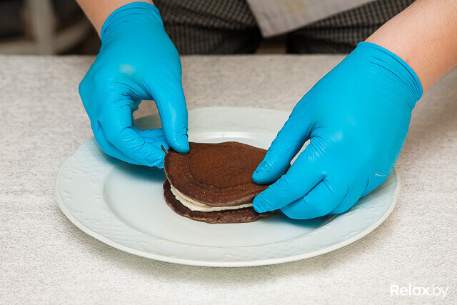 Пухлые обжаренные блинчики шеф-повар собрал в десертную конструкцию: своеобразный блинный торт, щедро промазанный сырно-творожным кремом. Десерт можно приготовить вечером, оставить на ночь в холодильнике, а с утра порезать получившийся блинный мини-торт на ломтики. Последний штрих ― обрамление десерта тонкой струйкой меда для вкусового контраста.