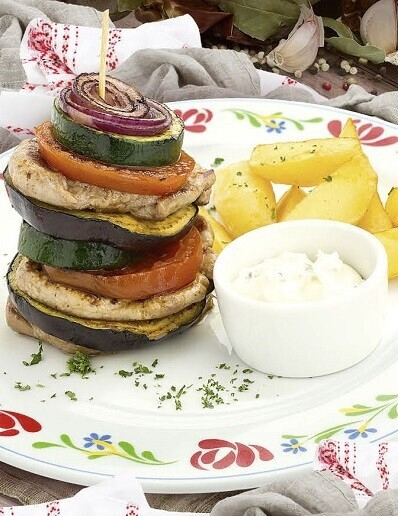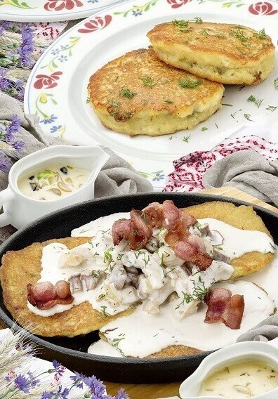 Драники «Сельские» с домашней колбасой, сливочным соусом с шампиньонами, беконом, сладким перцем и луком пореем