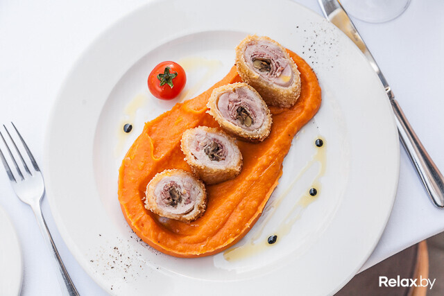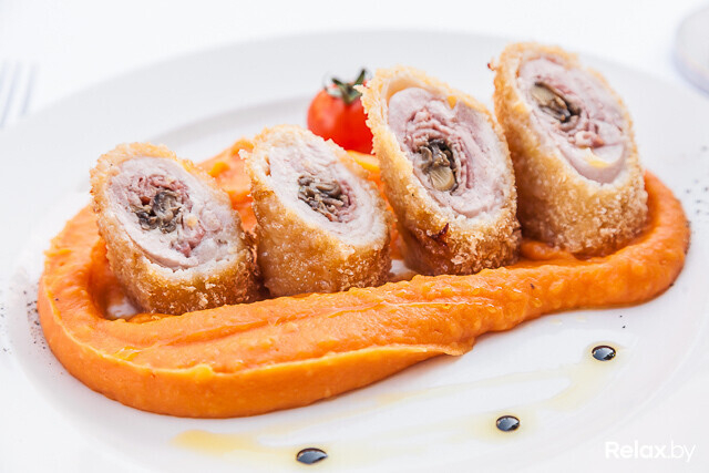 На отбитое куриное бедро, лишенное костей, укладывают бекон и шампиньоны, добавляют специи и лимонный сок, после чего заготовку не трогают в течение 5 часов. Позже рулет обжаривается в хрустящей панировке на сливочном масле до золотистой корочки. Насыщенные башенки сочного рулета дополняет компенсирующее, с кислинкой, томатное пюре.
