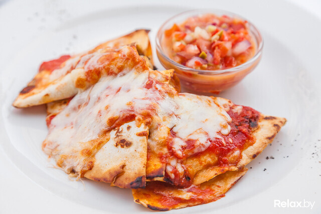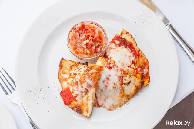 Куриное филе обжаривают с чесноком и шампиньонами с добавлением сливок и овощного бульона. Тушеной до состояния соуса массой начиняют лепешку и несколько минут запекают под сыром «Моцарелла». Пикантное и сочное блюдо подают с соусом «Сальса» из красного лука, томатов, огурца и черных маслин.