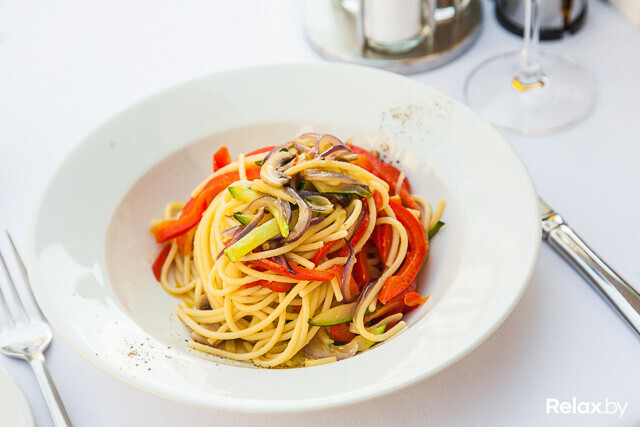 Спагетти дополняют красный лук, болгарский перец, кабачок цукини и шампиньоны, обжаренные на растительном масле с добавлением овощного бульона и трюфельного масла.
