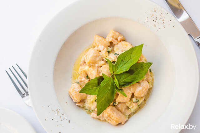 Из перетертого на мелкой терке отварного картофеля с мукой, манной крупой, сыром «Пармезан» и соусом «Помодоро» делают колбаски, которые отваривают с растительным маслом. Дополняют их обжаренной слабо-соленой семгой с добавлением бульона, сливок и цукини. Мягкие ньокки подают в получившемся соусе, украшенными свежим базиликом.