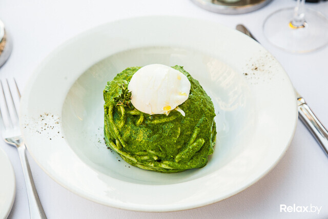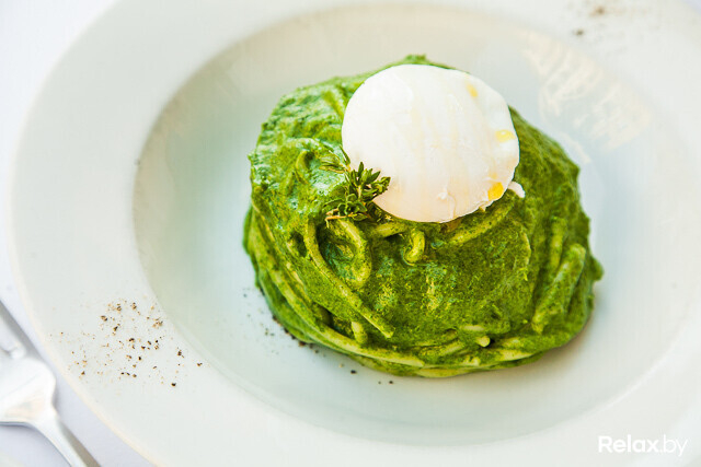 Спагетти тушат в соусе из обжаренного со сливками и перебитого в пюре шпината. Яйцо пашот укладывают на уже готовую «горку», чтобы при разрезании жидкий желток присоединился к соусу. Нежное и сытное блюдо подается со свежим тимьяном.