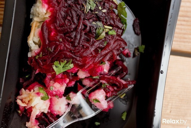 Салат «Сельдь без шубы» (картофель, филе сельди, свекла, цветная капуста, лук репка, яблоки, рисовый уксус, сироп топинамбура, морская соль, бальзамический уксус, кинза, черный перец) — 165 ккал