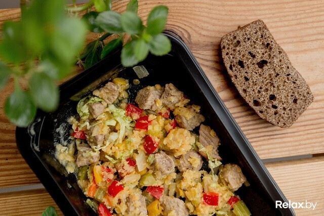 Теплый салат с говядиной, овощами и чечевицей (тазобедренная часть говядины, перец сладкий, чечевица красная, апельсин, стебель сельдерея, пекинская капуста, репчатый лук, оливковое масло, сухой тимьян, соевый соус, морская соль) — 368 ккал