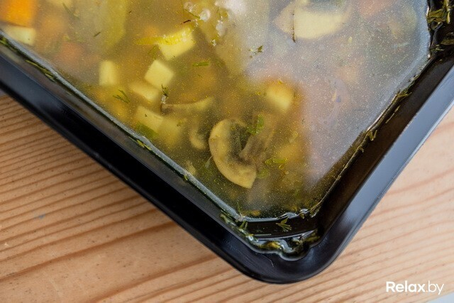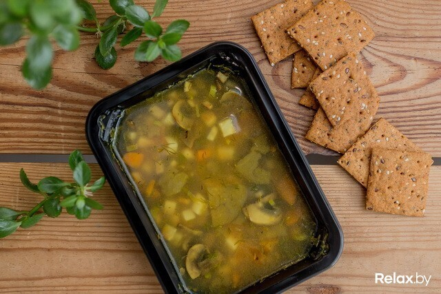 Суп «Баклажанный» (вода, баклажаны, свежие томаты, корень сельдерея, картофель, морковь, шампиньоны, оливковое масло, корень петрушки, морская соль, зеленый лук, орегано, сухой тимьян, черный перец, сумах) — 58 ккал