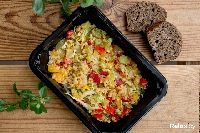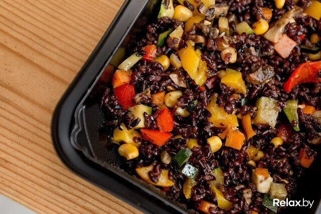 Дикий рис с овощами (дикий рис, цуккини, сладкий перец, кукуруза, стебель сельдерея, морковь, шампиньоны, морская соль, темная горчица, сухой пажитник, куркума, сухой имбирь, черный перец, калинджи, зира, фенхель молотый) — 135 ккал