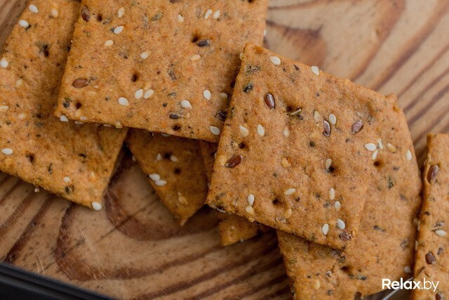 Цельнозерновые полбяные крекеры (полбяная цельнозерновая мука, вода, мука спельта цельнозерновая мелкого помола, оливковое масло, семена льна, кунжут, лимон, паприка, сода, сухой базилик, морская соль, зира) — 126 ккал
