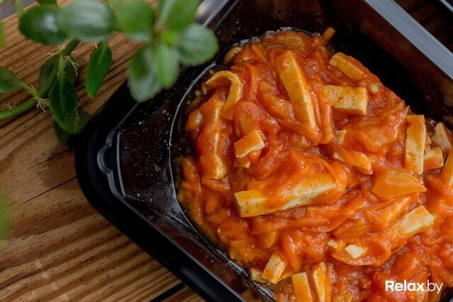 Тофу в кисло-сладком соусе (тофу, томаты очищенные в томатном соке, вода, морковь, перец сладкий, соевый соус, апельсин, кукурузный крахмал, чеснок, перец чили свежий, оливковое масло, морская соль) — 143 ккал