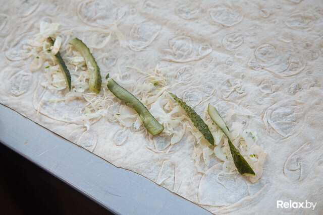 К слову, важно правильно нарезать лаваш. Даже самый острый нож, если положить лаваш просто на столешницу, разрежет криво. Для нарезки шеф-повар «скручивает» лаваш, а уже потом отрезает нужную длину.