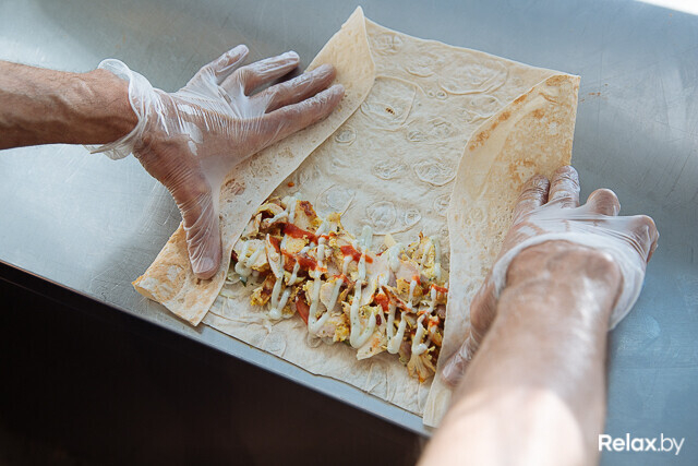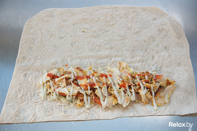 Когда начинка, соусы, мясо и лаваш готовы, все упаковывается в привычную нам форму и отправляется на гриль. В состав шаурмы можно добавлять что угодно. К примеру, даже сыр. Спустя минуту шаурма готова к употреблению.