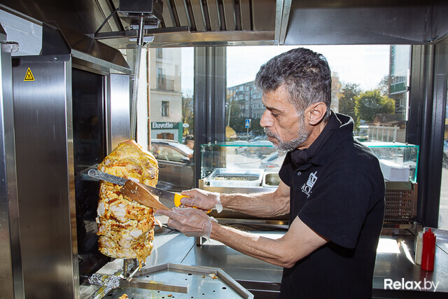 — Дело в том, что нельзя использовать самый верхний слой мяса. Оно срезается, и из него шаурма не делается, потому что мясо сухое. А вот следующий слой как раз для нашей шаурмы годится! — рассказывает Ихаб Джахджах.