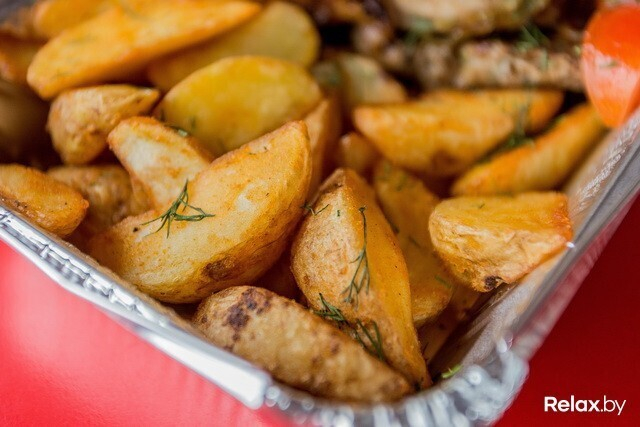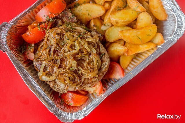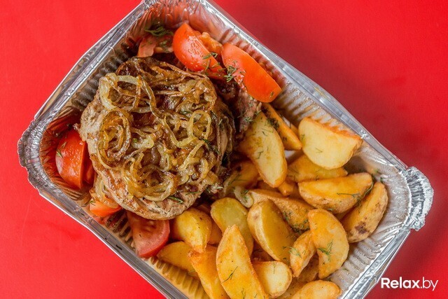 Первое, что удивило и порадовало одновременно, — это размер порций. Свинина — добротный кусок мяса (180 гр), обжаренный на гриле, украшенный пассерованным луком и дольками помидора. Гарнир — немалое количество золотистых кусочков картофеля по-деревенски, посыпанных свежим укропчиком.