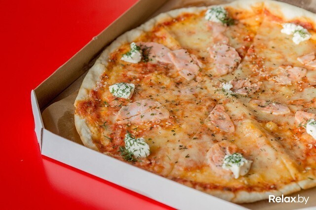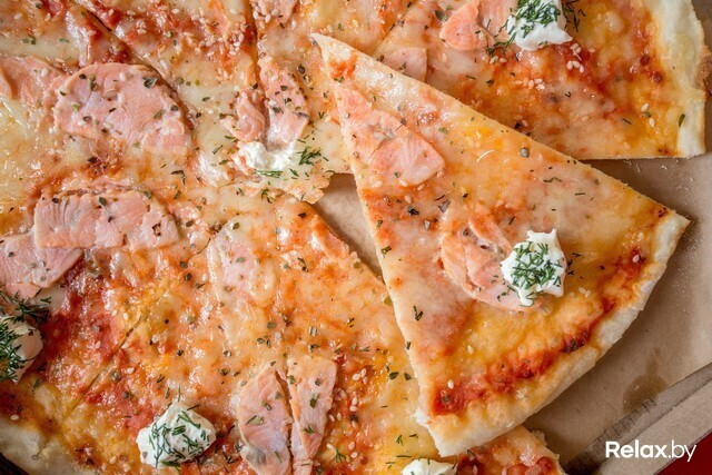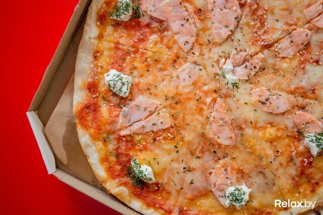 Пицца «Филадельфия» — эдакий итальянский вариант суши с рыбой и сливочным сыром. На вид, правда, блюдо оказалось не самым удачным (нам показалось пустоватым), зато по вкусу не подкачало: тонкая лепешка (также из теста собственного приготовления), кусочки красной рыбы и нежного сливочного сыра с соусом — интересное и немного непривычное сочетание.