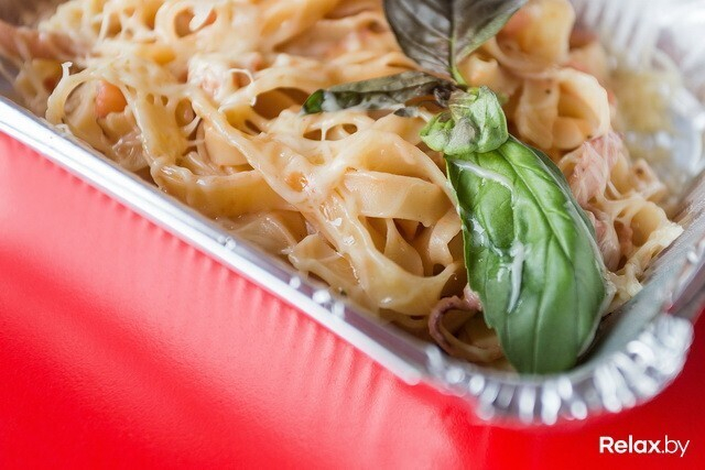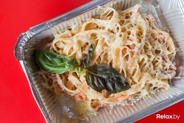 В доставке «Три повара» Тальятелли с морепродуктами представляют собой пасту собственного приготовления с добавлением морского коктейля, чесночного и томатного соусов, сливок, свежего базилика и лимона. А расплавленный сверху мелко натертый сыр — то, что нужно!