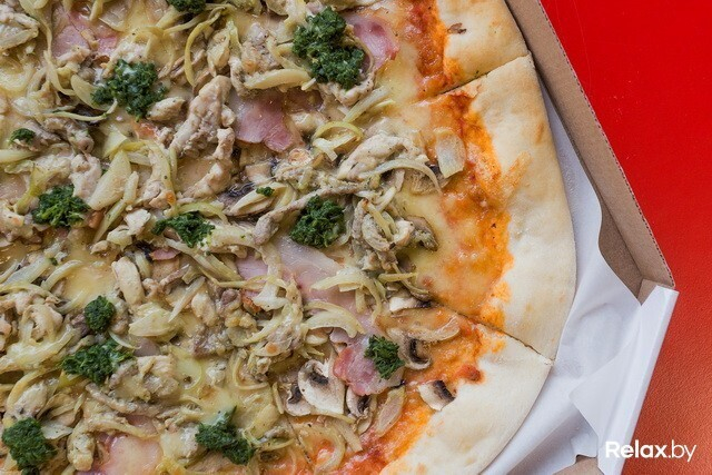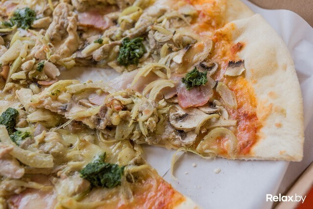 Пицца на тонком тесте понравится любителям разнообразной начинки: тут вам и несколько видов мяса (свинина, грудинка, куриное филе), и грибы, и шпинат, и сыр моцарелла, и лук. Правда, последнего, как нам показалось, многовато. Зато как пахнет! Дополняют вкус приправы, соевый соус, чеснок и молотый перец.