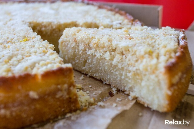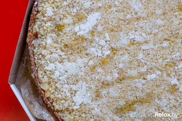 Мы попробовали лимонный с крошкой — очень вкусно! Готовят его из муки разного помола, растительного масла, сахара, агар-агара, лимона и сметаны. Сам по себе пирог очень большой, тяжелый и не очень сладкий — значит, сахара в тесто добавляют немного, что автоматически делает его привлекательным для следящих за фигурой.