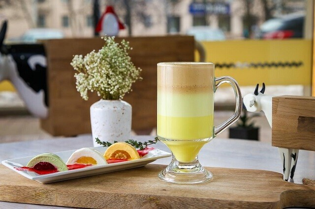 1. Фирменный капучино наоборот (сверху все начинается с холодного эспрессо-крема, перетекает в теплый молочный крем и впадает в горячий молочный слой)