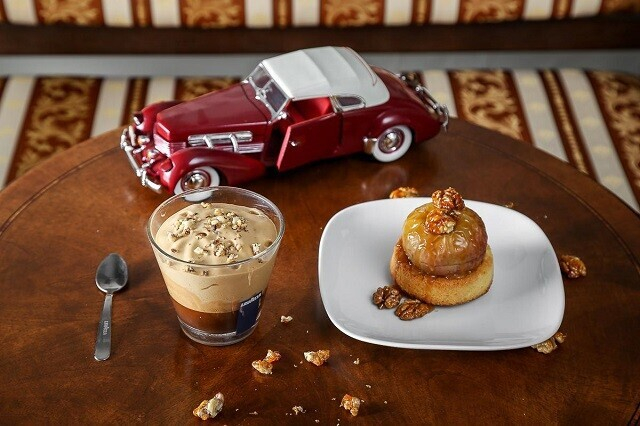 2. Десерт Аннет Крузе: печеное яблоко в карамели с сердцем из крема патисьер на подушке из саварена, декорированное карамелизованным грецким орехом