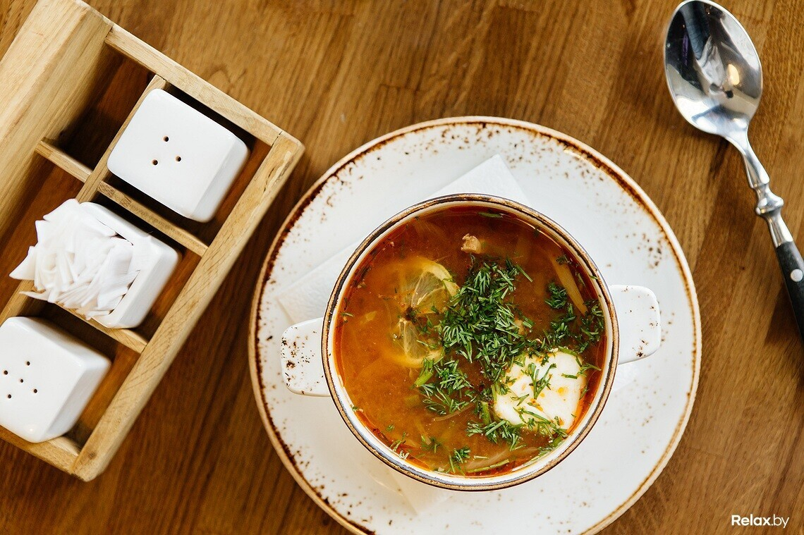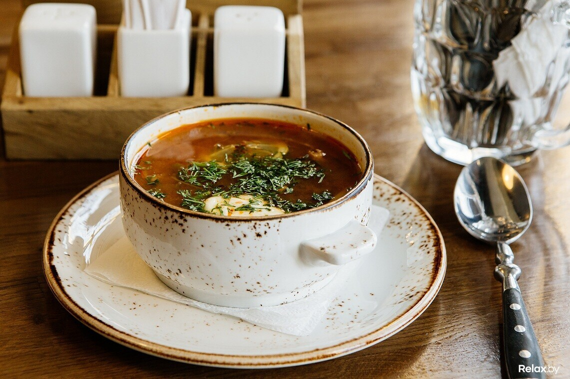 В обеденное меню «BEERжи» входят супы, салаты, горячие блюда и гарниры. Начнем с первого. Одно из самых популярных у посетителей блюд — сборная солянка: наваристый суп с копченой птицей (2,8 рубля).
