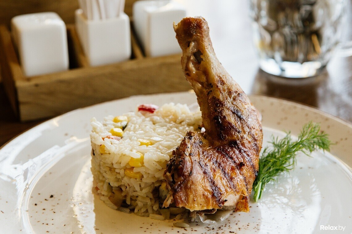 Из горячих блюд повара заведения рекомендуют оценить ароматную птицу-гриль с сацебеле.