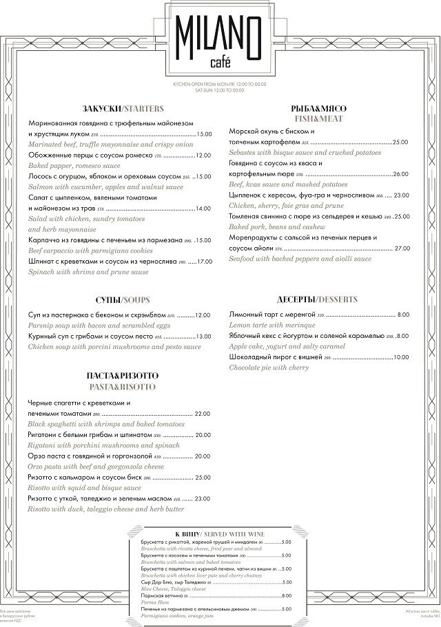 В столичном кафе Milano изменилось меню: теперь оно состоит исключительно из новых блюд от шеф-повара Сергея Ворошилова, выходца из французской школы Le Cordon Bleu. Появился даже раздел «К вину» — там можно подобрать изысканную закуску к разным сортам напитка.