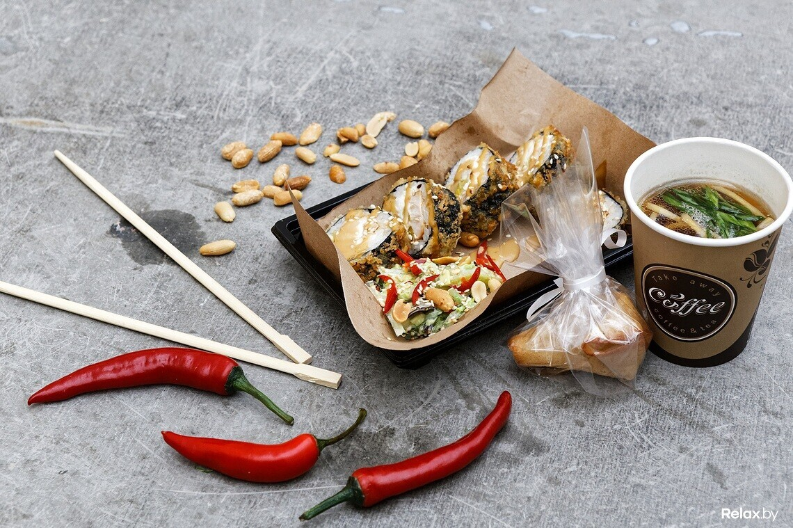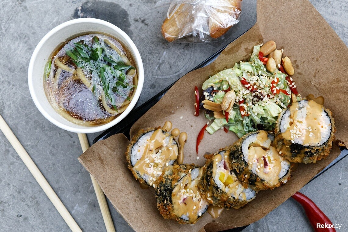 Фрай-ролл из пяти кусочков на выбор: острый с курицей и ролл «Сакура фрай» с клубничным мармеладом, а также салат на основе морских водорослей с ореховым соусом и бульон рамэн с лапшой и зеленым луком. И комплимент в виде печенья с предсказанием. Ролл будет подаваться с соусом «Лос-Анджелес». Блюдо представит TokiNY — победитель «Гастрофеста Азия». Цена — 7,5 руб.