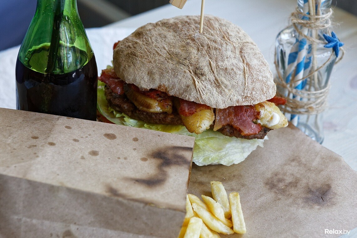 Байкер-сет №3: бургер с котлетой и беконом (чиабатта, мясная котлета, бекон, соус барбекю, соус тар-тар, жареный банан, микс-салат, красный лук), картофель фри, кола. Цена — 16 рублей