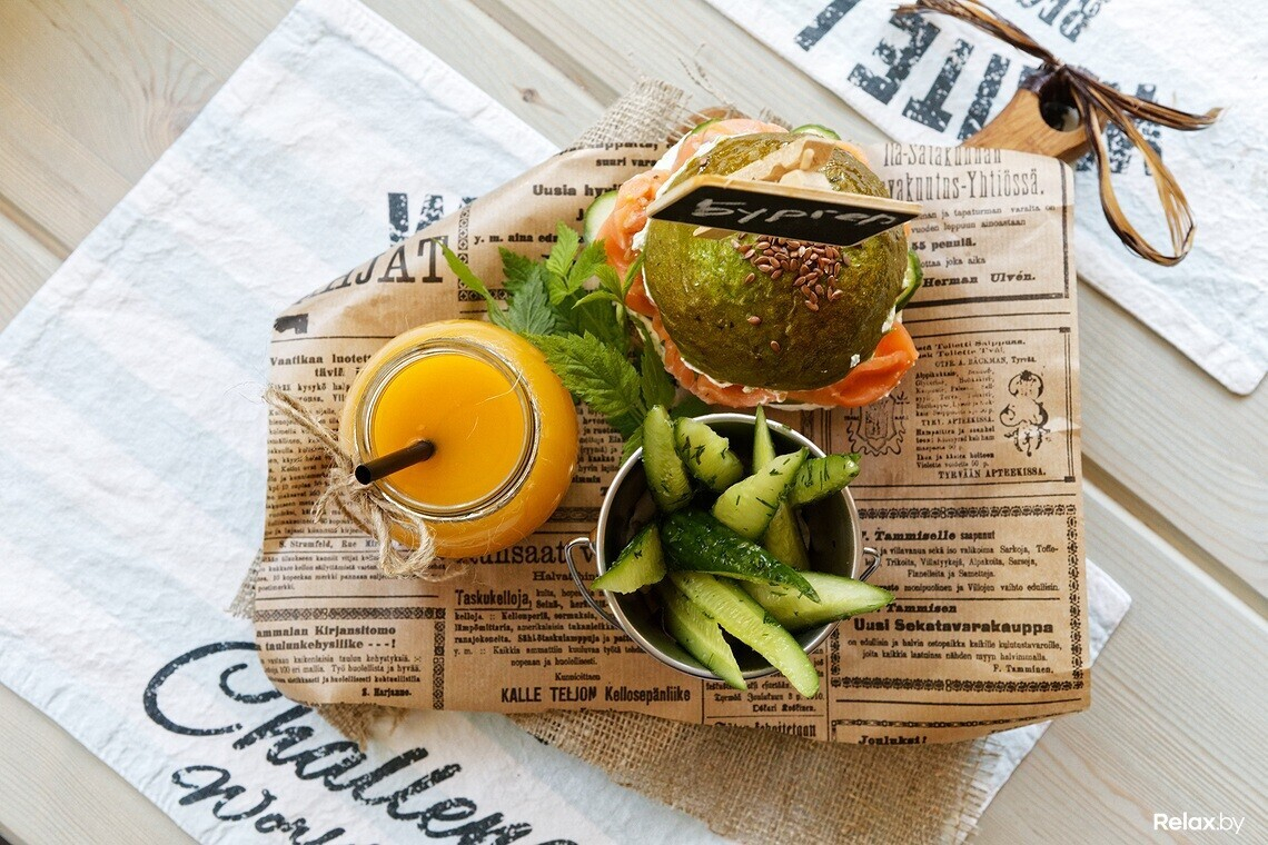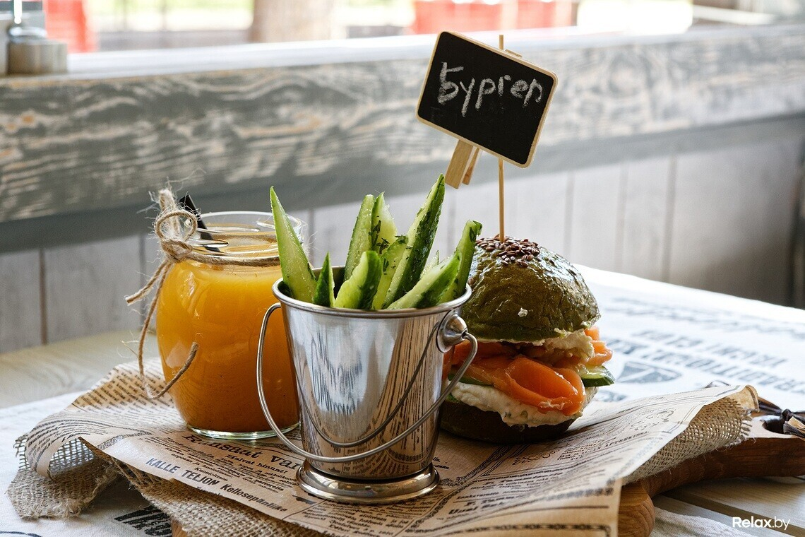 Велосет №1: зеленый бургер с семгой (бургер-булка, творожная паста, рыба, королевские креветки, бекон, домашний майонез), огурцы собственного засола, морс облепиховый. Цена — 16 рублей