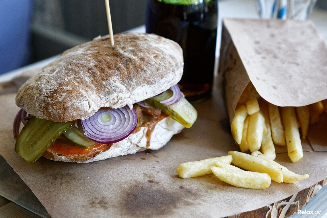 Байкер-сет №2: бургер с томленым мясом и овощами (чиабатта, томленое мясо с овощами, соус барбекю, корнишоны, микс-салат, красный лук), картофель фри, кола. Цена — 12 рублей