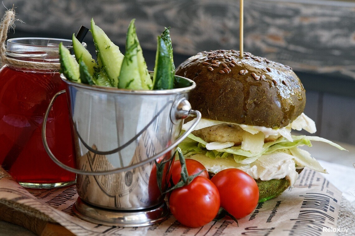 Велосет №2: зеленый бургер с рубленой куриной котлетой (бургер-булка, рубленая куриная котлета, соус «Цезарь», сыр пармезан, свежий томат, красный лук, микс-салат), огурцы собственного засола, морс облепиховый. Цена — 12 рублей