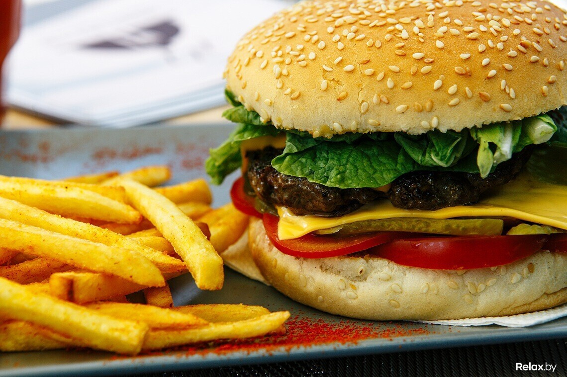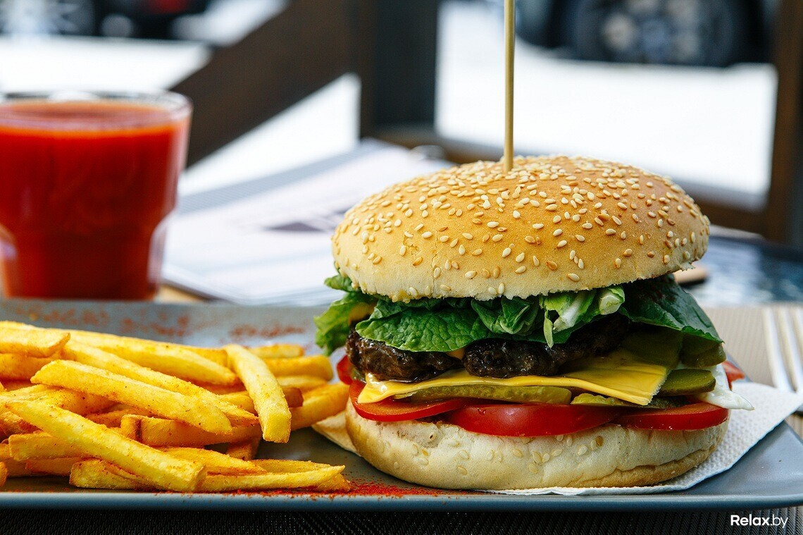 Бургеры здесь представлены в четырех вариациях: с сочными котлетами из говядины и различными дополнениями; их подают на стильных вытянутых темных тарелках.
