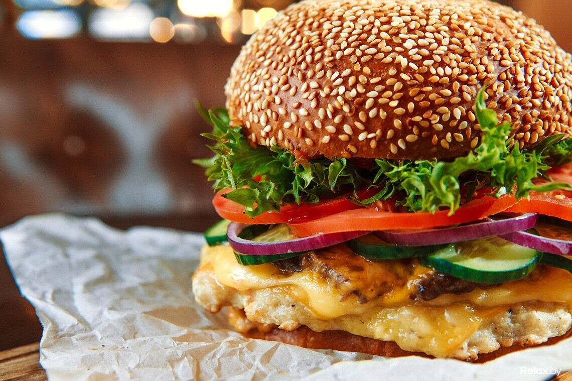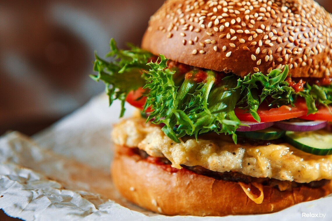Внутри — 3 котлеты (две из мраморной говядины, одна — из куриного филе), копченый сыр и ломтик Чеддера, сочные овощи и специальный соус с каперсами и копченой паприкой.