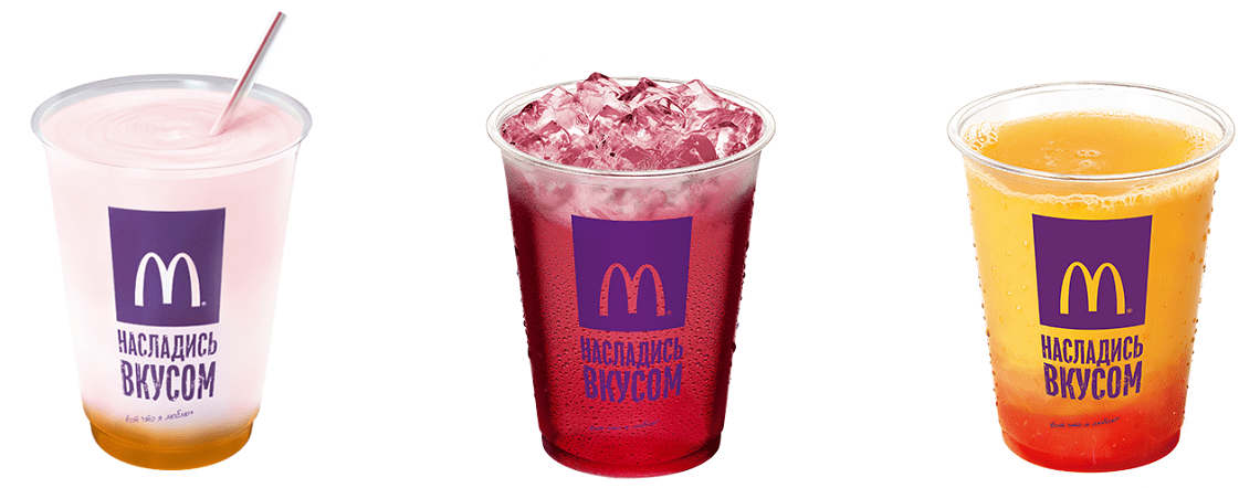 Из напитков стоит обратить внимание на «Шейк Персик Мельба» — молочный коктейль с малиновым сиропом и персиком, а также на уникальный напиток, рецептура которого разработана специально для Беларуси: «Санрайз» готовят на основе апельсинового сока с добавлением сиропа «Гренадин», обеспечивающего гранатовый привкус. Появились еще освежающие лимонады с вишневым и малиновым вкусами.