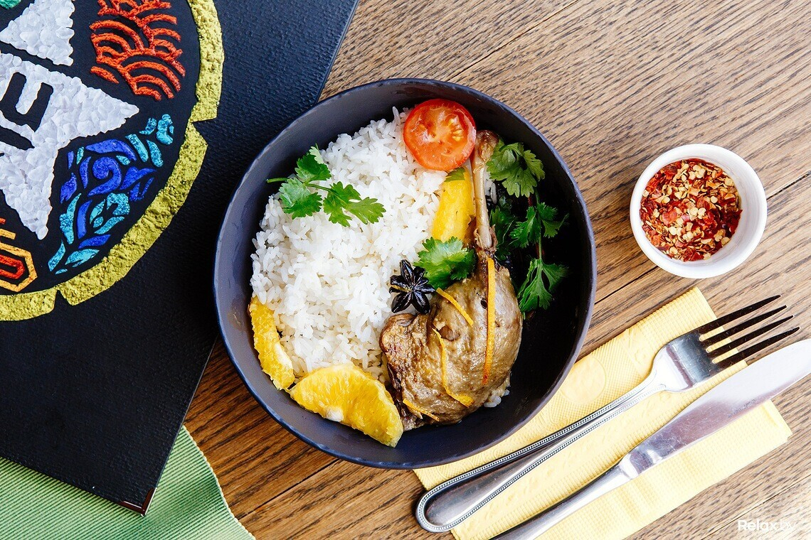 Утка в апельсиновом соусе: утка, апельсиновый соус, рис. Цена — 14,5 руб.