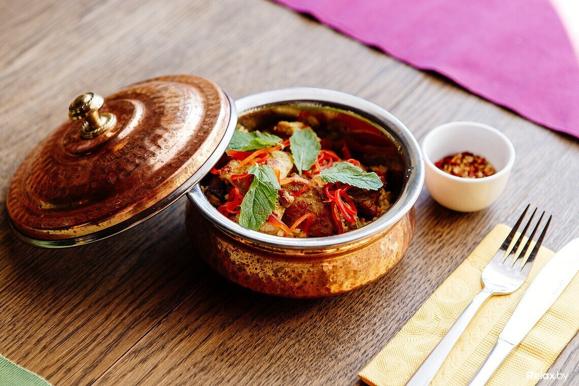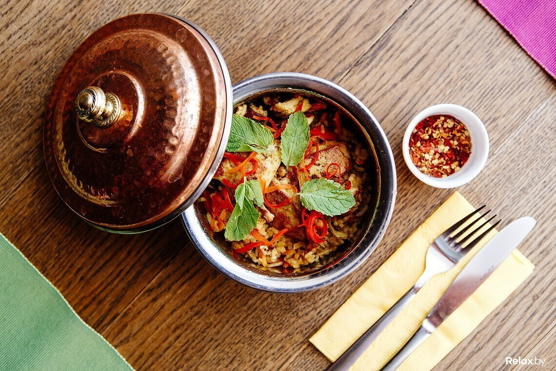 Индийский плов с курицей: рис с корицей, анисом, кумином, карри, чесноком, гвоздикой, тмином, морковью, красным перцем и курицей. Цена — 12,5 руб.