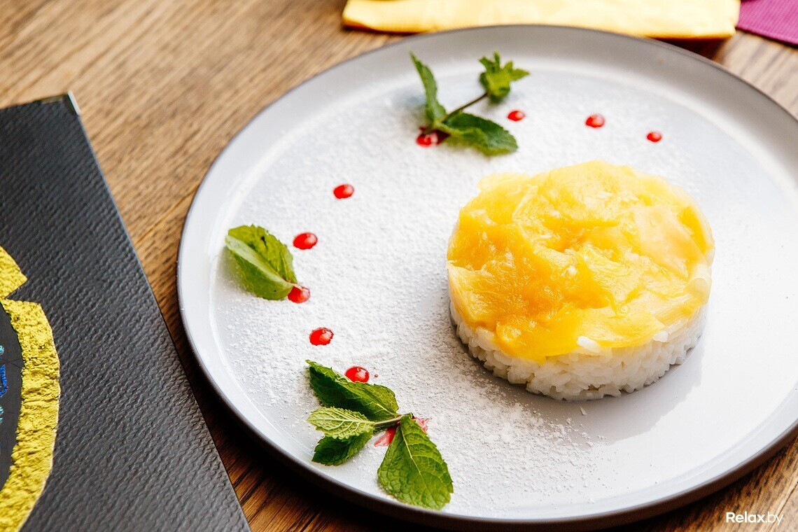 Десерт манго-рис: мякоть манго на подушке из клейкого риса с кокосовым молоком. Цена — 6,5 руб.