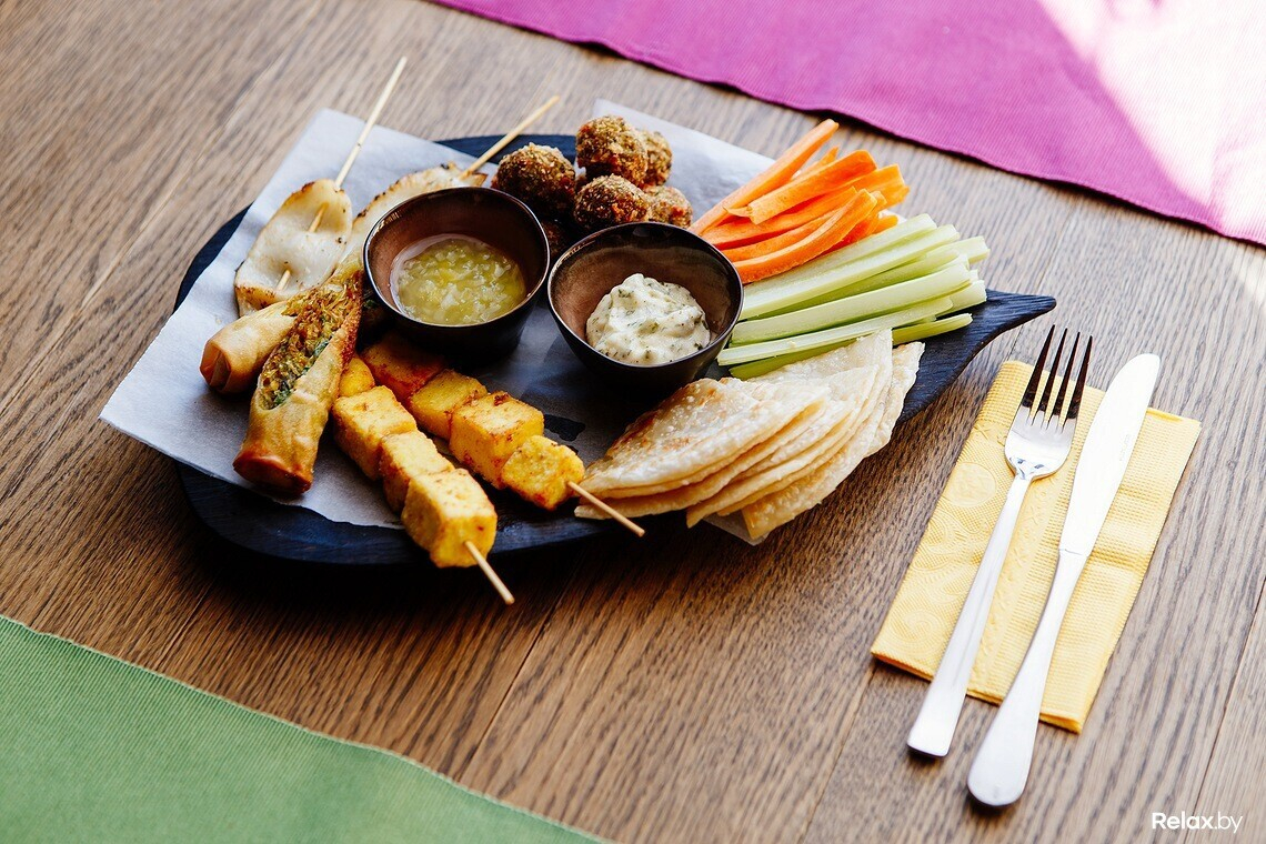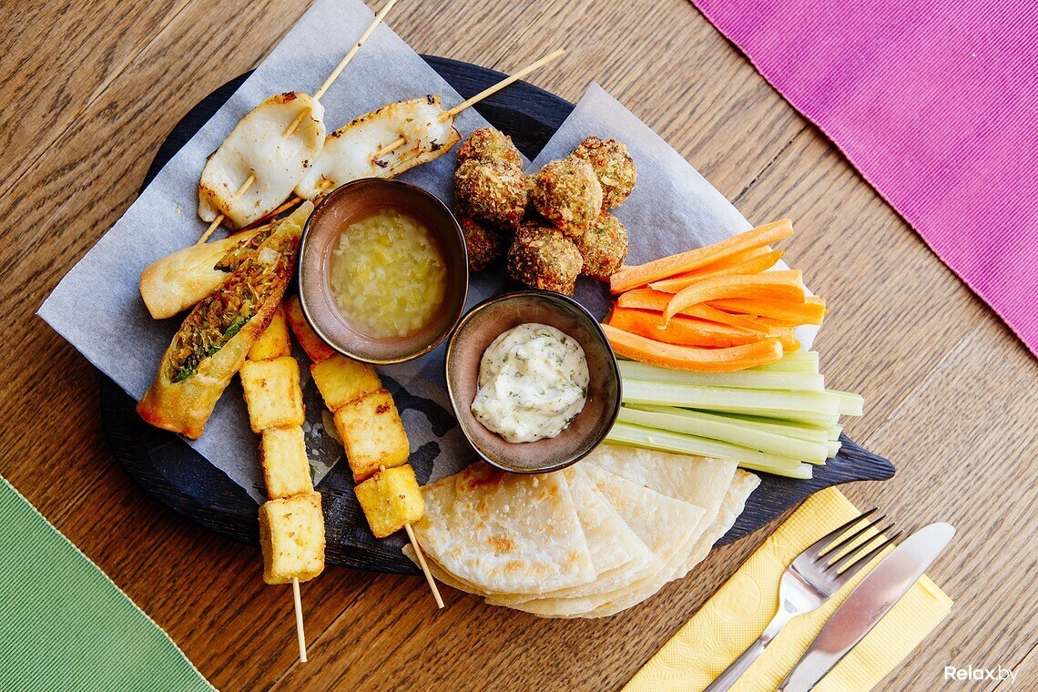Азиатский сет: сатэ из кальмаров, жареный панир, спринг-ролл с овощами, лепешка роти, шарики брокколи тай чиз, сельдерей, морковь, соусы Айолио и Манго. Цена — 23,5 руб.