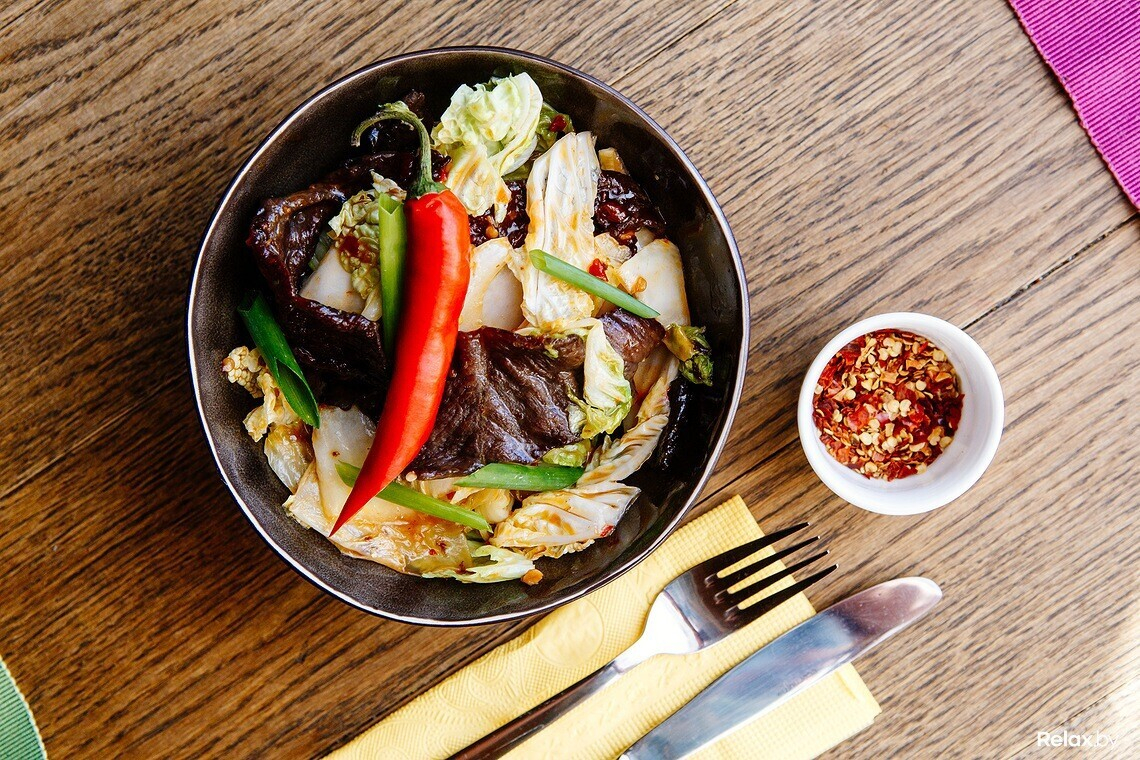 Говядина по-сычуаньски: говядина, китайский салат, лук, перец чили, соус. Цена — 13 руб.