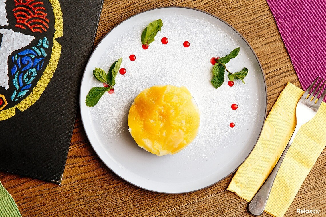 Королевские креветки и манго: креветки, манго, соус из кокосового молока, имбиря, перца чили и зелени. Украшаются мятой и помидорами черри. Цена — 39,9 руб.