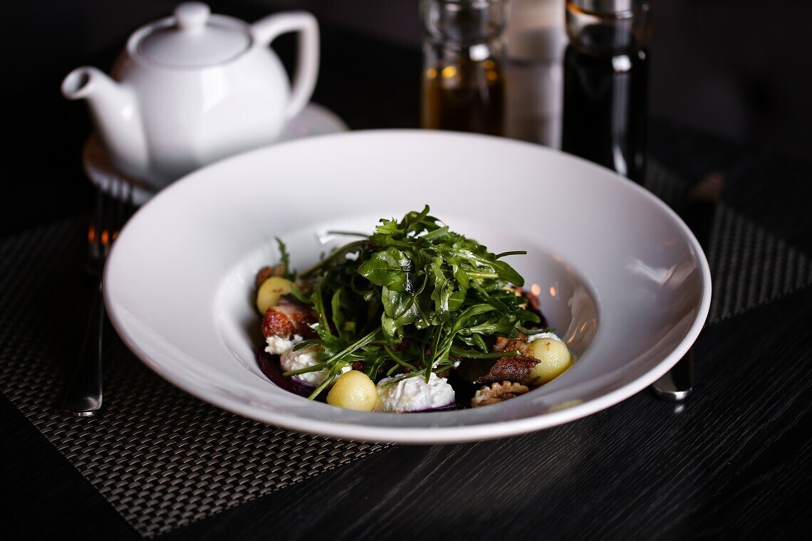 Салат с уткой, маринованной свеклой и домашним творожным муссом